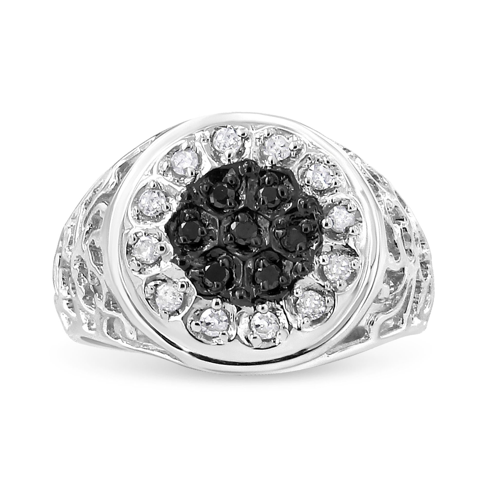 This distinguished cluster ring makes a bold fashion statement, rich with contrasting black and white diamond cluster accents. For this sophisticated design, twelve shimmering white diamonds halo seven black, color treated diamonds in an eye-catching circular motif. Exquisite decorative detailing showcases a gorgeous openwork filigree design along the shank for added appeal. This .925 sterling silver ring is stunning with a total of nineteen 1/4ct TDW, prong-set diamonds with an approximate I3 Clarity. A smart look for all occasions, this striking design will effortlessly complement his suave charm.